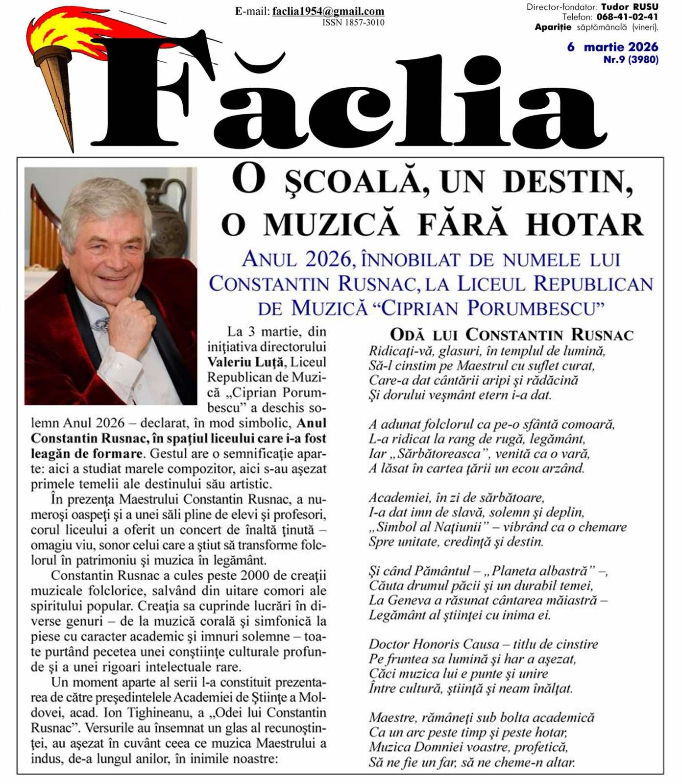 Săptămânalul „Făclia” din 6 martie curent a reflectat acest moment într-un amplu reportaj intitulat „O școală, un destin, o muzică fără hotar”, consemnând lansarea „Anului Constantin Rusnac” la Liceul „Ciprian Porumbescu”, precum și o premieră editorială – publicarea „Odei lui Constantin Rusnac”, semnată de acad. Ion Tighineanu, în semn de recunoștință și apreciere pentru contribuțiile remarcabile ale Maestrului la dezvoltarea artei muzicale și la promovarea patrimoniului cultural pe plan național și internațional.