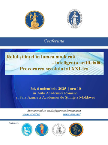 Pe 6 noiembrie, cu începere de la ora 10:00, în Aula Academiei Române și Sala Azurie a Academiei de Științe a Moldovei, se va desfășura conferința „Rolul științei în lumea modernă – inteligența artificială. Provocarea secolului al XXI-lea”, un eveniment de anvergură organizat de Academia Română și Academia de Științe a Moldovei, în parteneriat cu Academia de Științe Agricole și Silvice „Gheorghe Ionescu-Șișești”, Academia de Științe Tehnice din România, Academia de Științe Medicale din România și Academia de Științe Juridice din România.