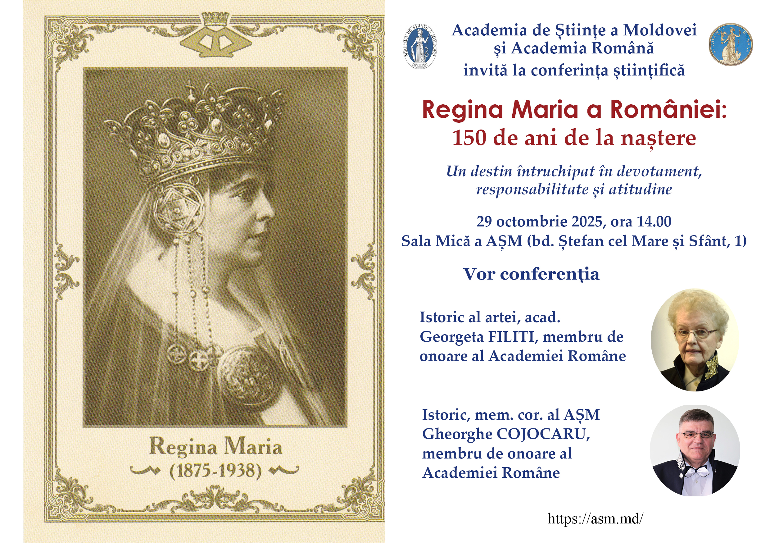 Miercuri, 29 octombrie 2025, ora 14.00, Academia de Științe a Moldovei și Academia Română organizează conferința științifică „Regina Maria a României – 150 de ani de la naștere. Un destin întruchipat în devotament, responsabilitate și atitudine”.