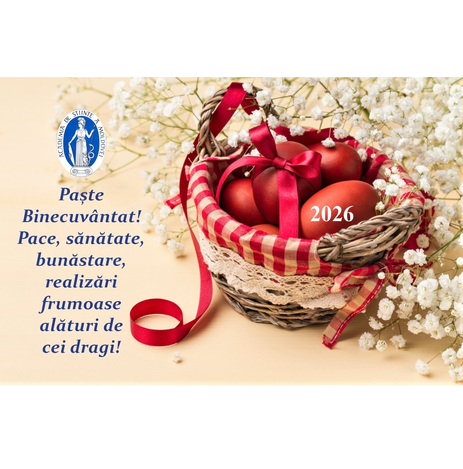 Prezidiul Academiei de Științe a Moldovei transmite întregii comunități academice alese gânduri de sănătate, pace și împliniri, alături de urări de noi realizări în activitatea științifică și culturală, cu prilejul Sfintelor Sărbători Pascale.