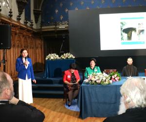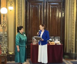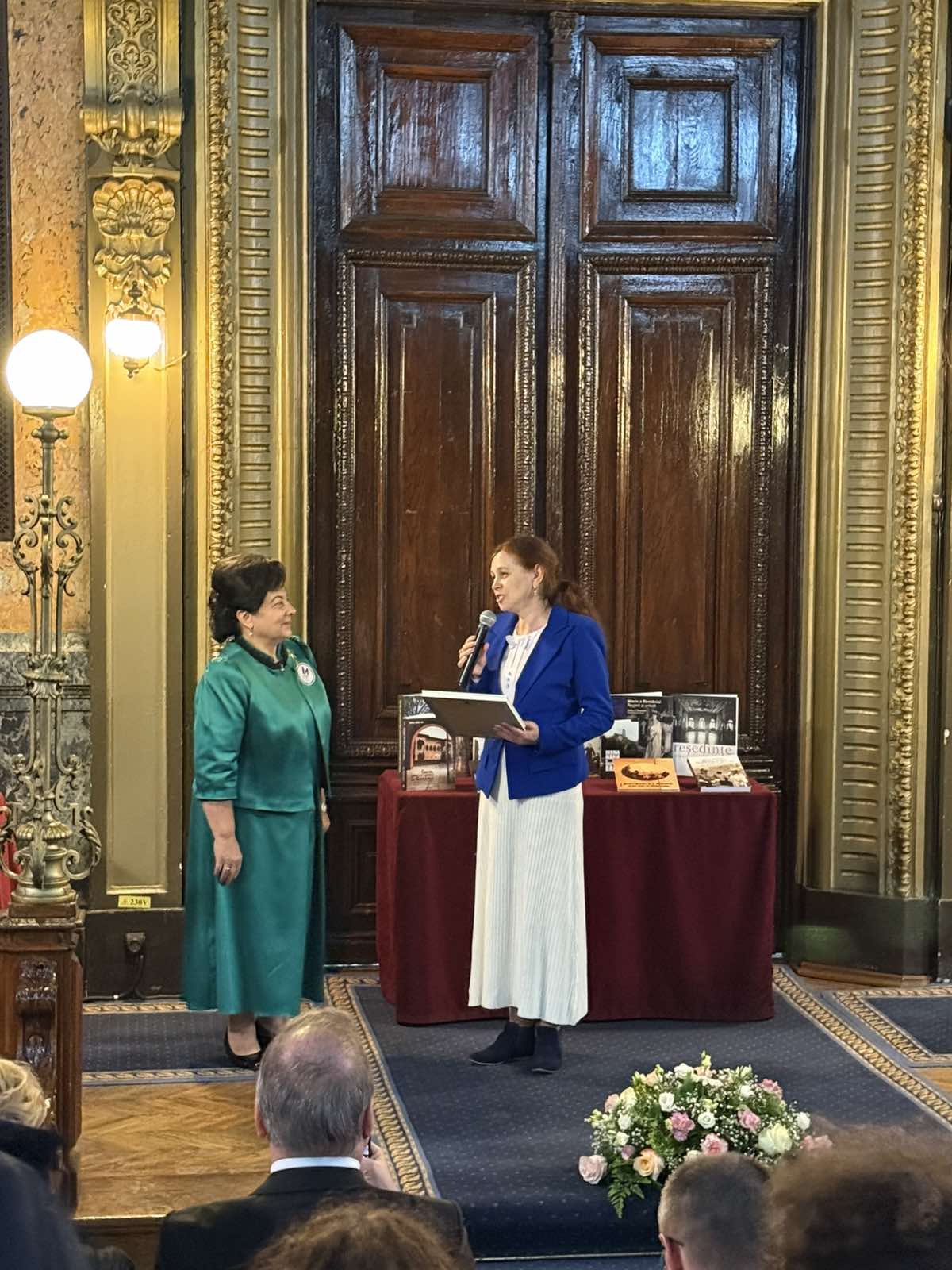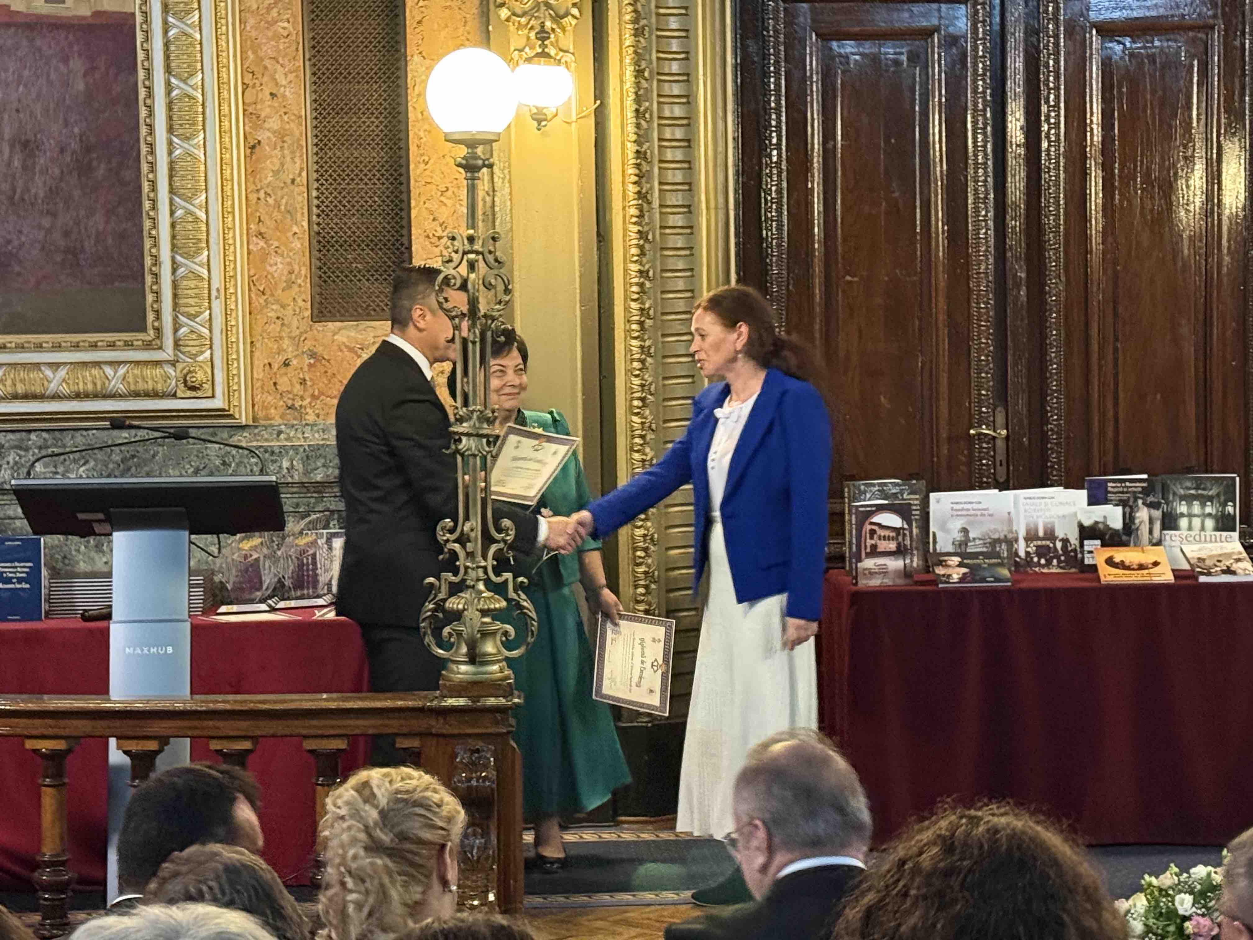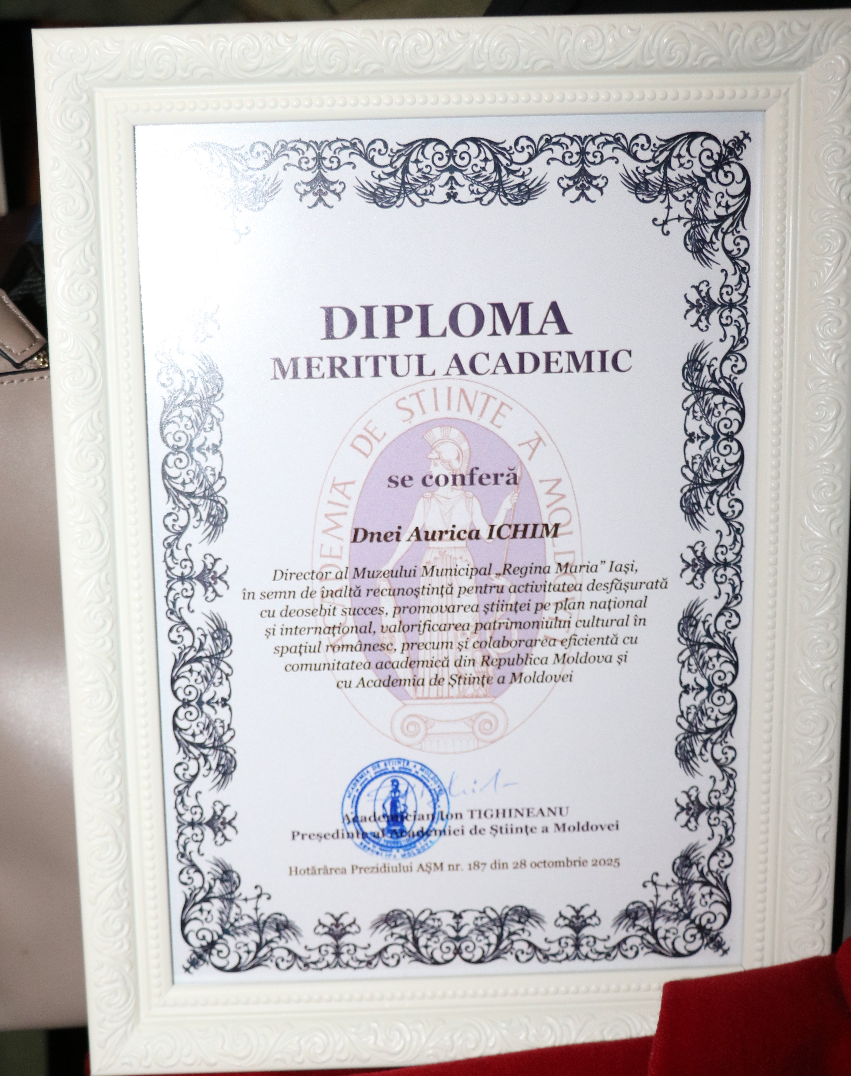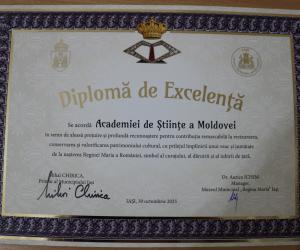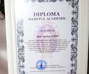 În cadrul sesiunii de conferire a distincțiilor, desfășurată în Aula ,,Carmen Sylva” a Universității ,,Gh. Asachi” Iași, în numele Prezidiului AȘM subsemnata a înmânat diploma „Meritul Academic” doamnei dr. Aurica Ichim, în semn de înaltă recunoștință pentru activitatea desfășurată în domeniul patrimonializării. De asemenea, la 150 de ani de la nașterea reginei Maria a România, Muzeul Municipal din Iași ce-i poartă numele și Primăria municipiului Iași au conferit pentru Academia de Științe a Moldovei „Diploma de Excelență” și Trofeul respectiv.
