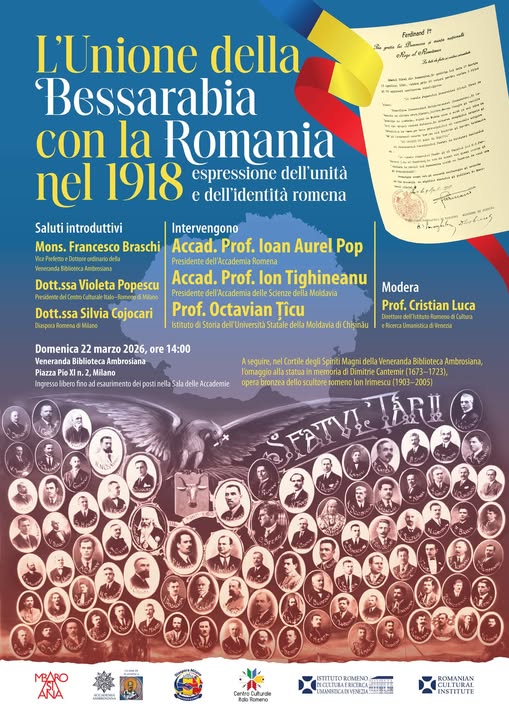 Simpozionul științific „Unirea Basarabiei cu România în 1918, expresie a unităţii şi identităţii românilor”, prilejuit de cea de-a 108-a aniversare a Unirii Basarabiei cu România, a adunat reprezentanți ai autorităților publice, ai asociațiilor culturale și științifice din nordul Italiei, membrii corpului consular, precum și repreznetanții numeroasei diaspore românești stabilite în Italia. Evenimentul din Milano se înscrie în șirul evenimentelor științifico-culturale axate pe reflectarea importanței Unirii Basarabiei cu România la 27 martie 1918, desfășurate în spațiul românesc.