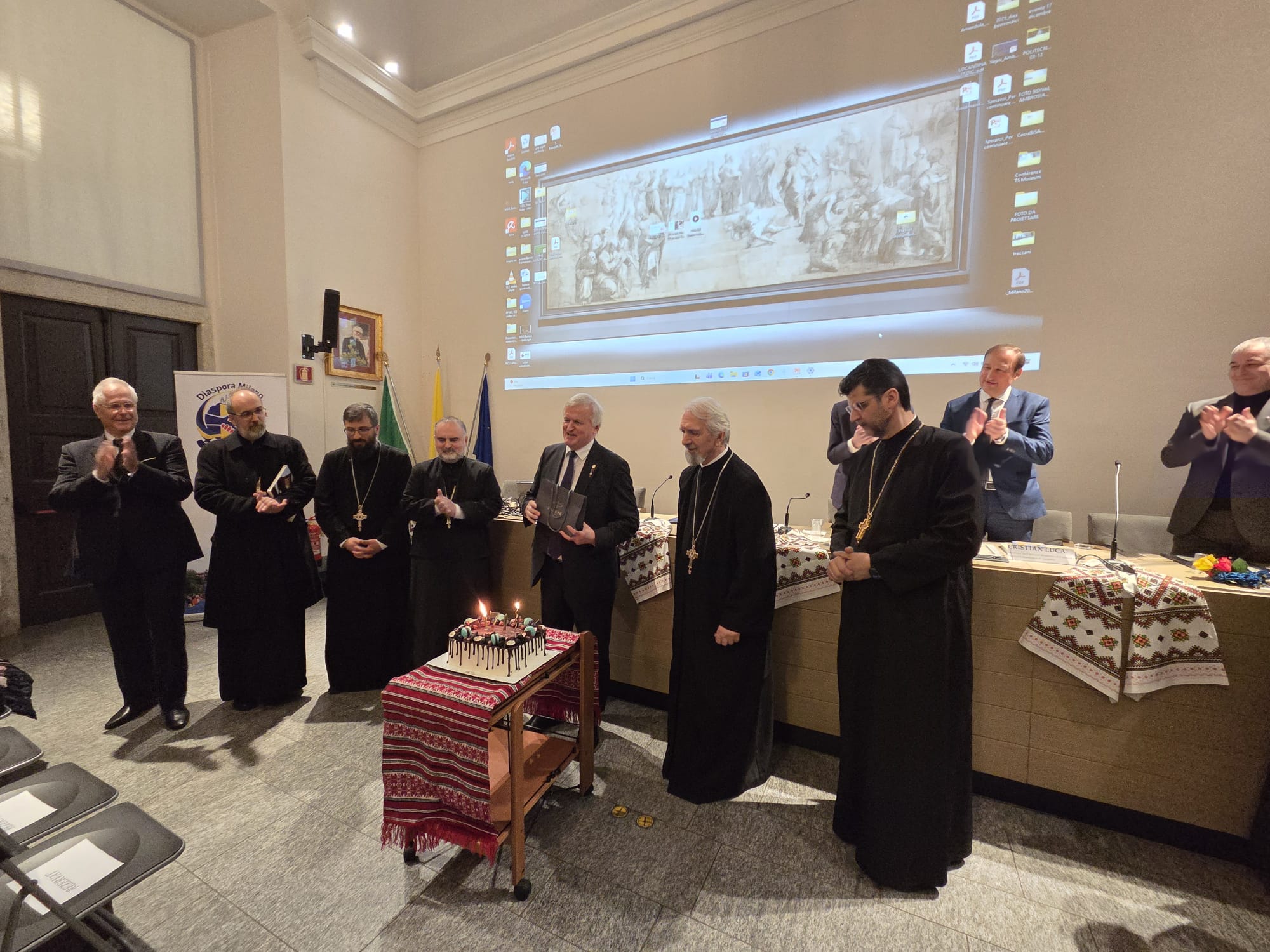 În deschiderea manifestării cultural-ştiinţifice au fost adresate mesaje de salut de Monseniorul Francesco Braschi, viceprefect al Bibliotecii Ambrosiana; dr. Violeta Popescu, preşedintele Centrului Cultural Italo-Român din Milano, doamna Silvia Cojocari, reprezentanta diasporei române din Milano. Lucrările simpozionului au fost moderate de prof. univ., dr. Cristian Luca, directorul Institutului Român de Cultură şi Cercetare Umanistică de la Veneţia.