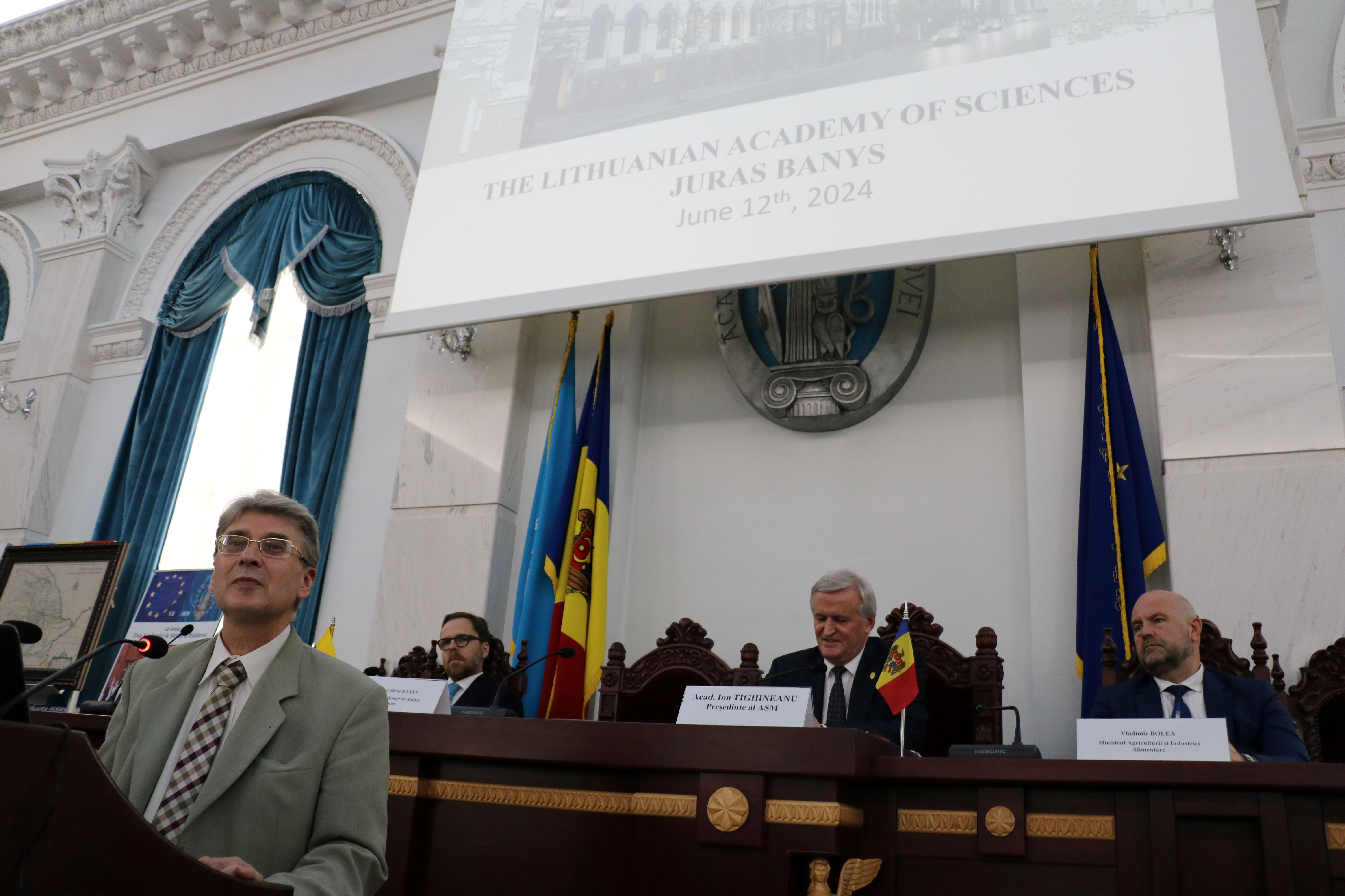 Conform programului ședinței festive aniversare a AȘM, i-a fost oferit cuvântul președintelui Academiei de Științe a Lituaniei, acad. Juras Banys. Savantul a prezentat instituția academică lituaniană, structura și specificul ei, s-a referit la activitatea de cercetare, integrarea tinerilor în știință, colaborarea internațională și alte aspecte ale activității Academiei din această țară baltică. La final, acad. Juras Banys și-a exprimat speranța că Academia de Științe a Moldovei va prospera, va deveni mai puternică. Este vitală existența Academiei, deoarece ea reunește cei mai buni oameni de știință și cercetători care contribuie la prosperarea țării.