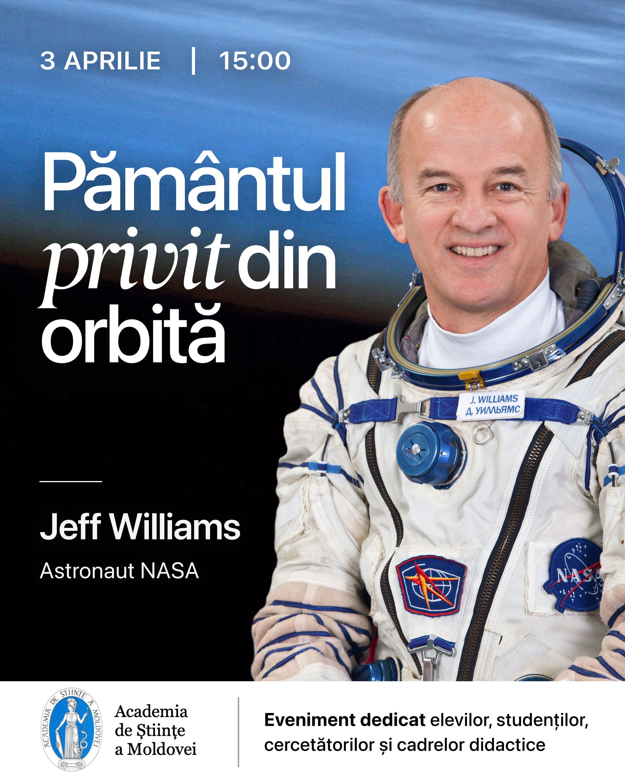 Academia de Științe din Moldova (AȘM) va găzdui pe 3 aprilie, începând cu ora 15:00, o întâlnire cu astronautul NASA Jeff Williams, care a participat direct la 4 expediții spațiale și a petrecut 534 de zile în spațiu, stabilind recordul NASA în 2016 pentru cea mai lungă durată cumulată pe orbită.