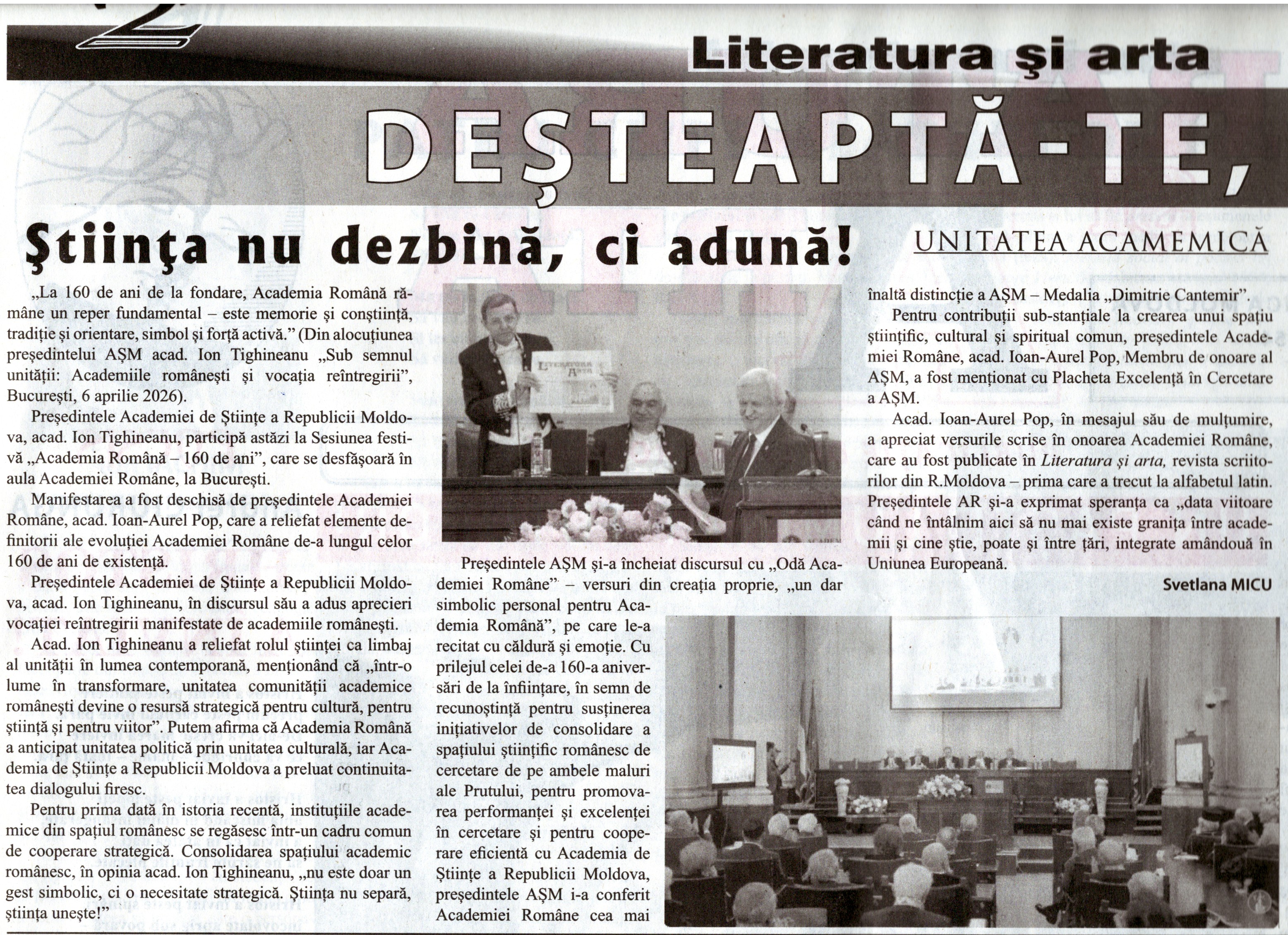 Președintele Academiei de Științe a Moldovei, acad. Ion Tighineanu, a participat la Sesiunea festivă „Academia Română – 160 de ani”, care a avut loc la 6 aprilie 2026, în Aula Academiei Române, la București. Evenimentul aniversar, care se înscrie în seria manifestărilor dedicate împlinirii a 160 de ani de la fondarea celui mai înalt for de consacrare științifică și culturală al României, a fost deschis de președintele Academiei Române, acad. Ioan-Aurel Pop.