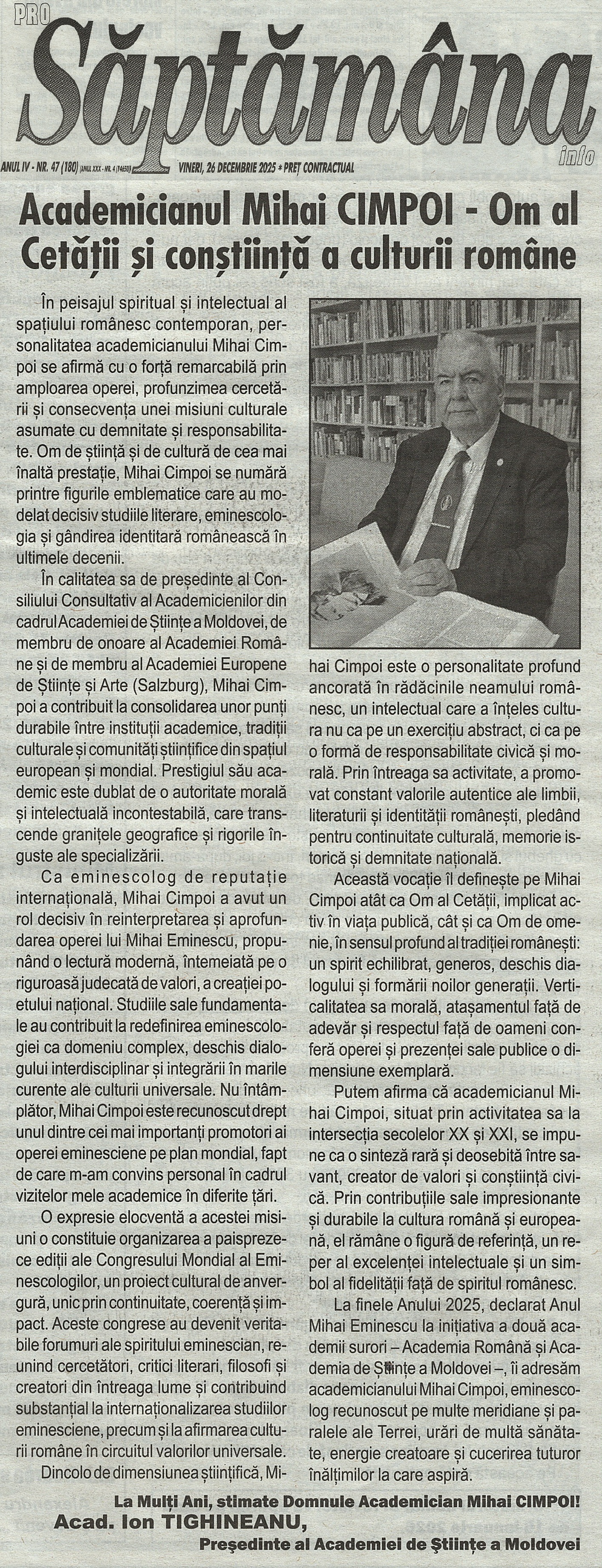 La finele Anului 2025, declarat Anul Mihai Eminescu la inițiativa a două academii surori – Academia Română și Academia de Științe a Moldovei –, îi adresăm academicianului Mihai Cimpoi, eminescolog recunoscut pe multe meridiane și paralele ale Terrei, urări de multă sănătate, energie creatoare și cucerirea tuturor înălțimilor la care aspiră.