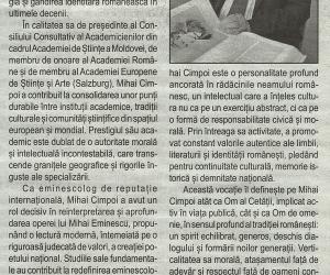În peisajul spiritual și intelectual al spațiului românesc contemporan, personalitatea academicianului Mihai Cimpoi se afirmă cu o forță remarcabilă prin amploarea operei, profunzimea cercetării și consecvența unei misiuni culturale asumate cu demnitate și responsabilitate. Om de știință și de cultură de cea mai înaltă prestație, Mihai Cimpoi se numără printre figurile emblematice care au modelat decisiv studiile literare, eminescologia și gândirea identitară românească în ultimele decenii.