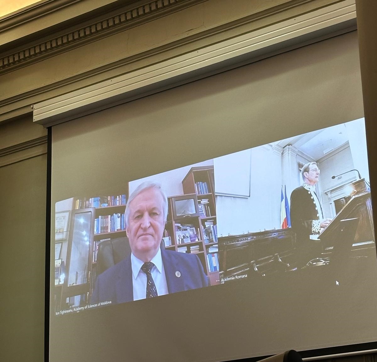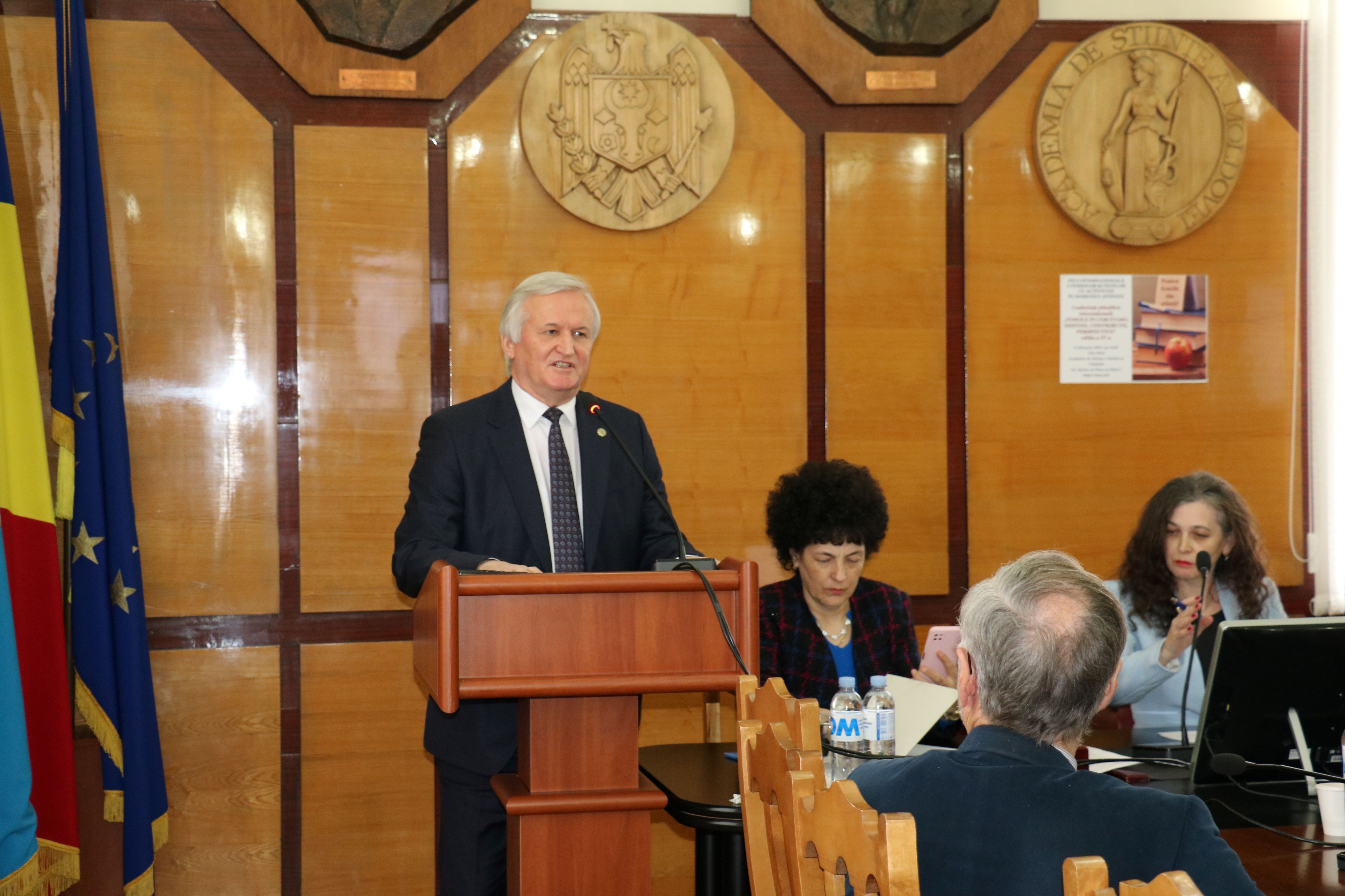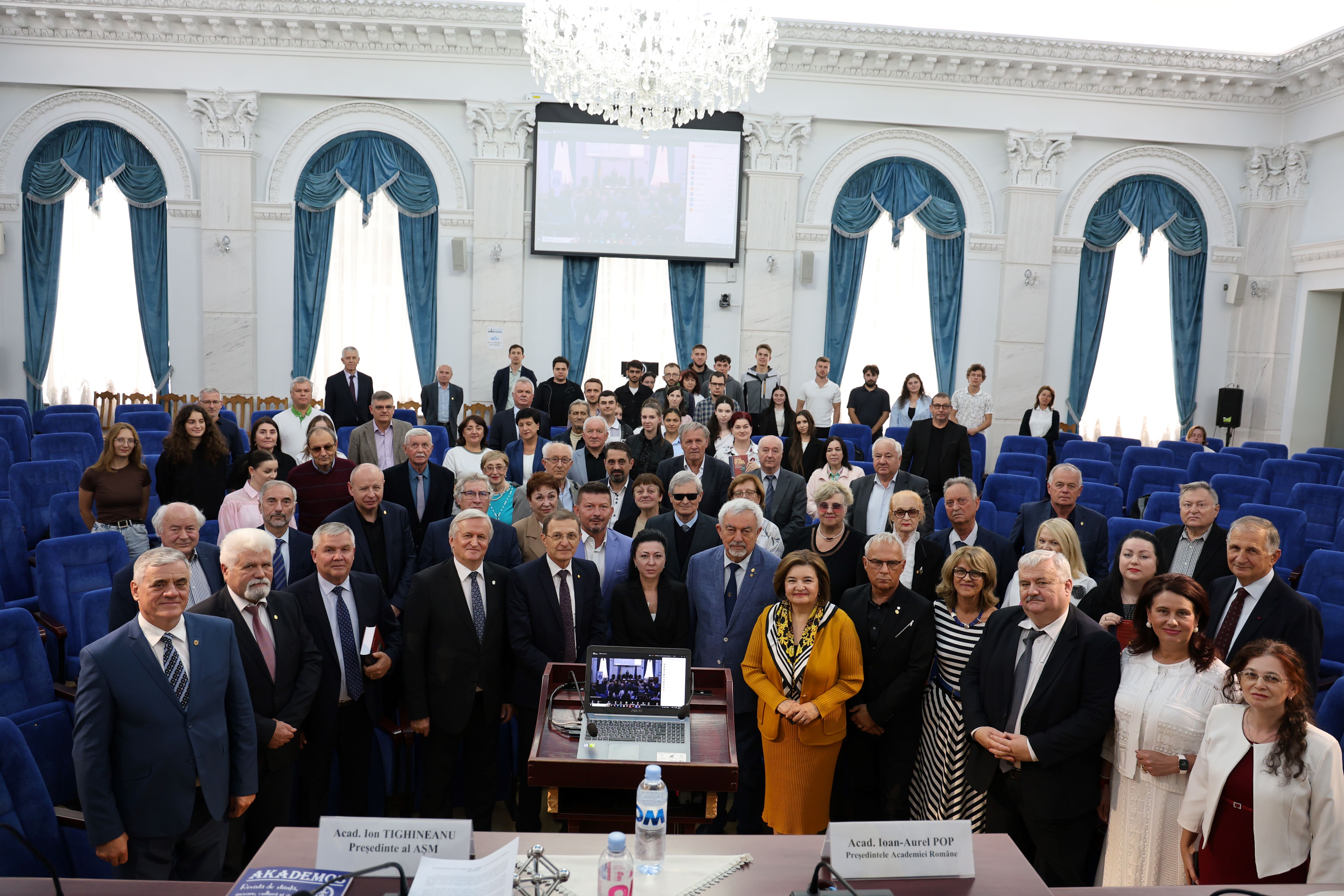 Întreaga noastră gratitudine se îndreaptă către Academia Română, care reprezintă un sprijin constant pentru Academia de Științe a Moldovei, contribuind la fortificarea spațiului științific și cultural românesc comun. Anul 2025 se conturează drept un an al realizărilor comune pe platforma de colaborare dintre Republica Moldova și România. Menționăm, în acest sens, manifestările științifico-culturale organizate împreună de cele două academii – o apropiere fără precedent între două academii-surori, care a condus la inițiativa declarării anului 2025 drept „Anul Mihai Eminescu” și la sărbătorirea împreună a Zilei Naționale a Culturii, Zilei Europei, Zilei Limbii Române, precum și la organizarea Congresului Mondial al Eminescologilor.