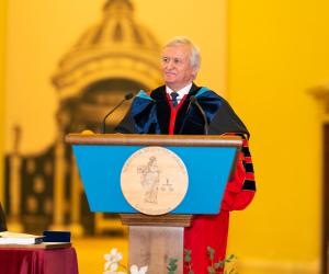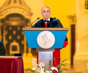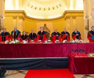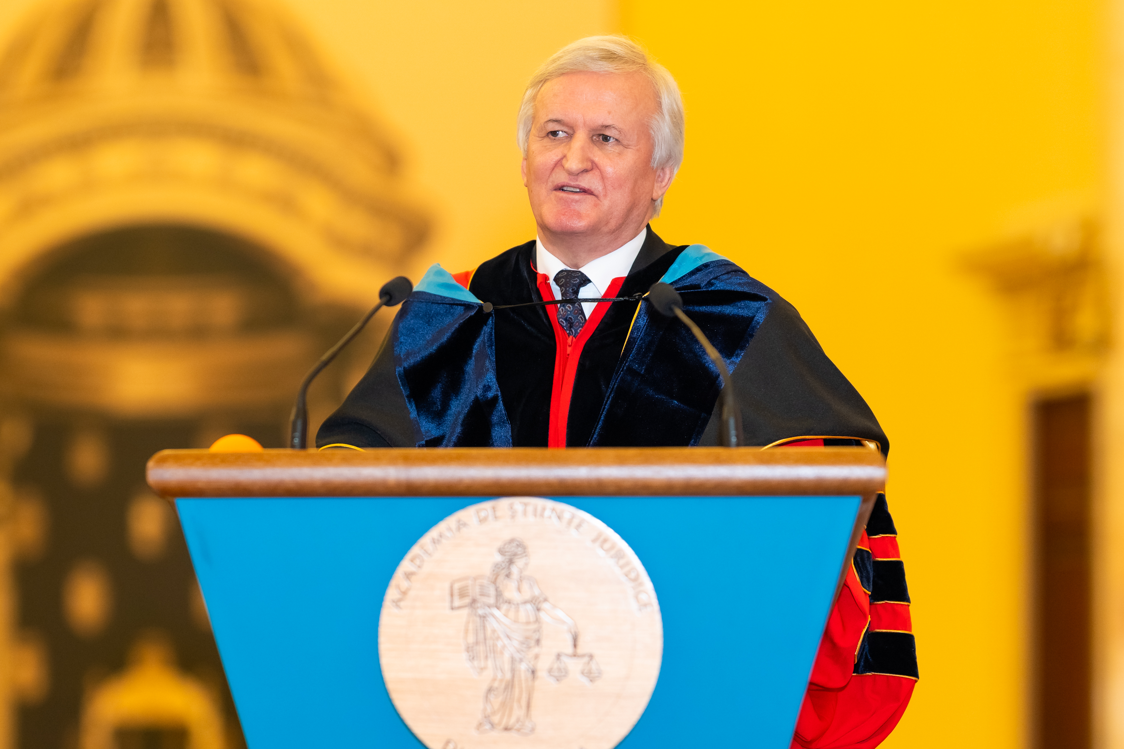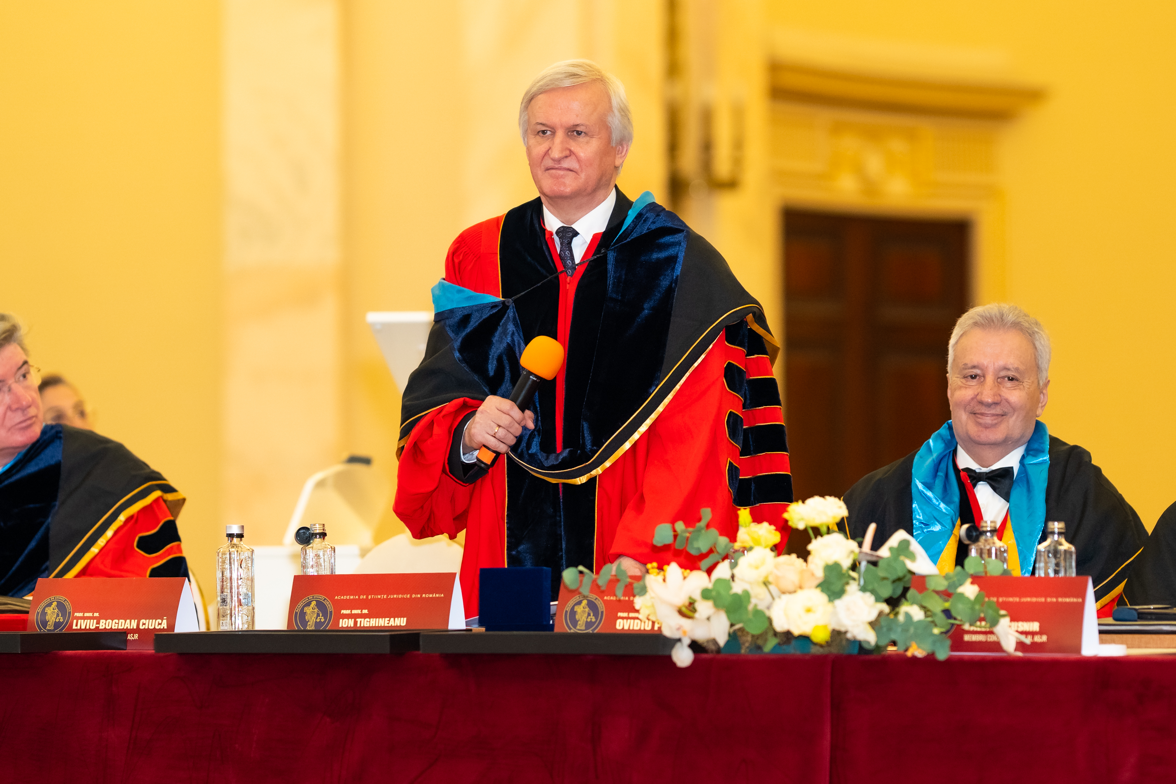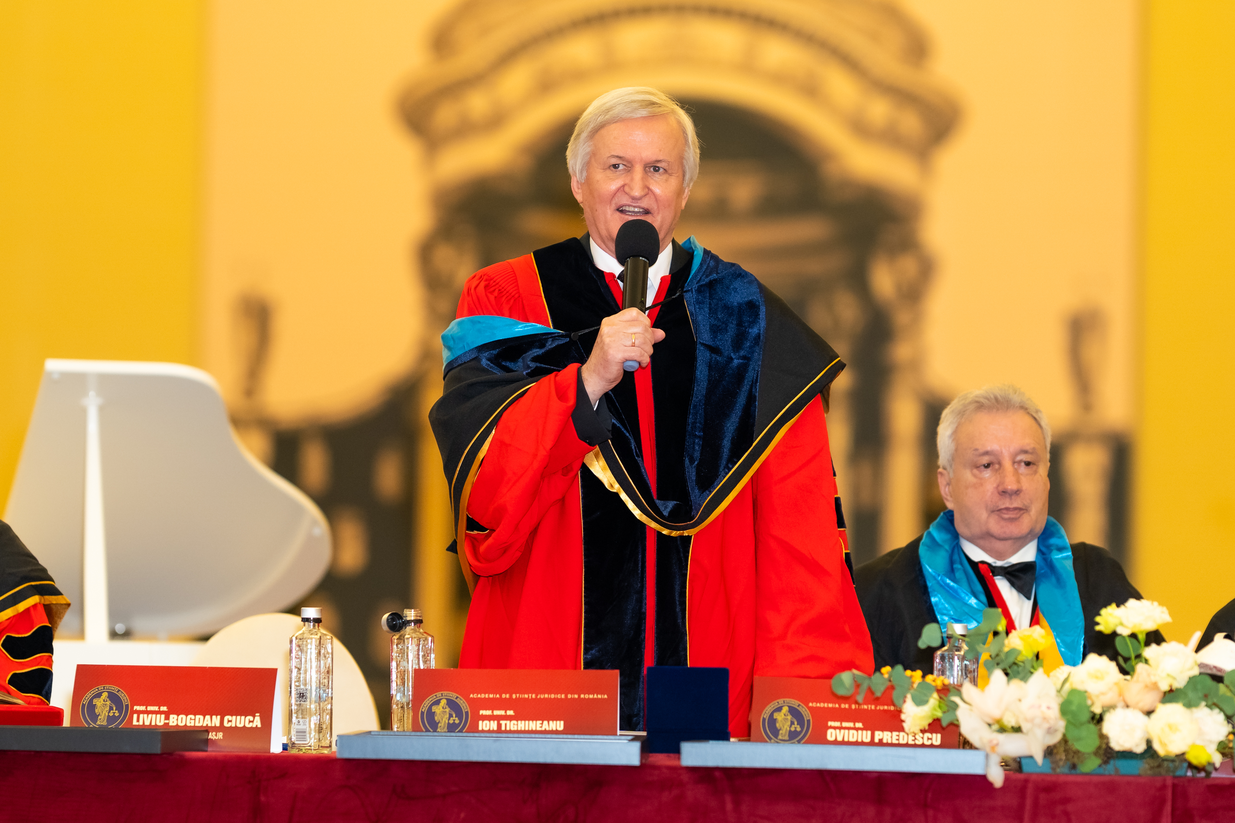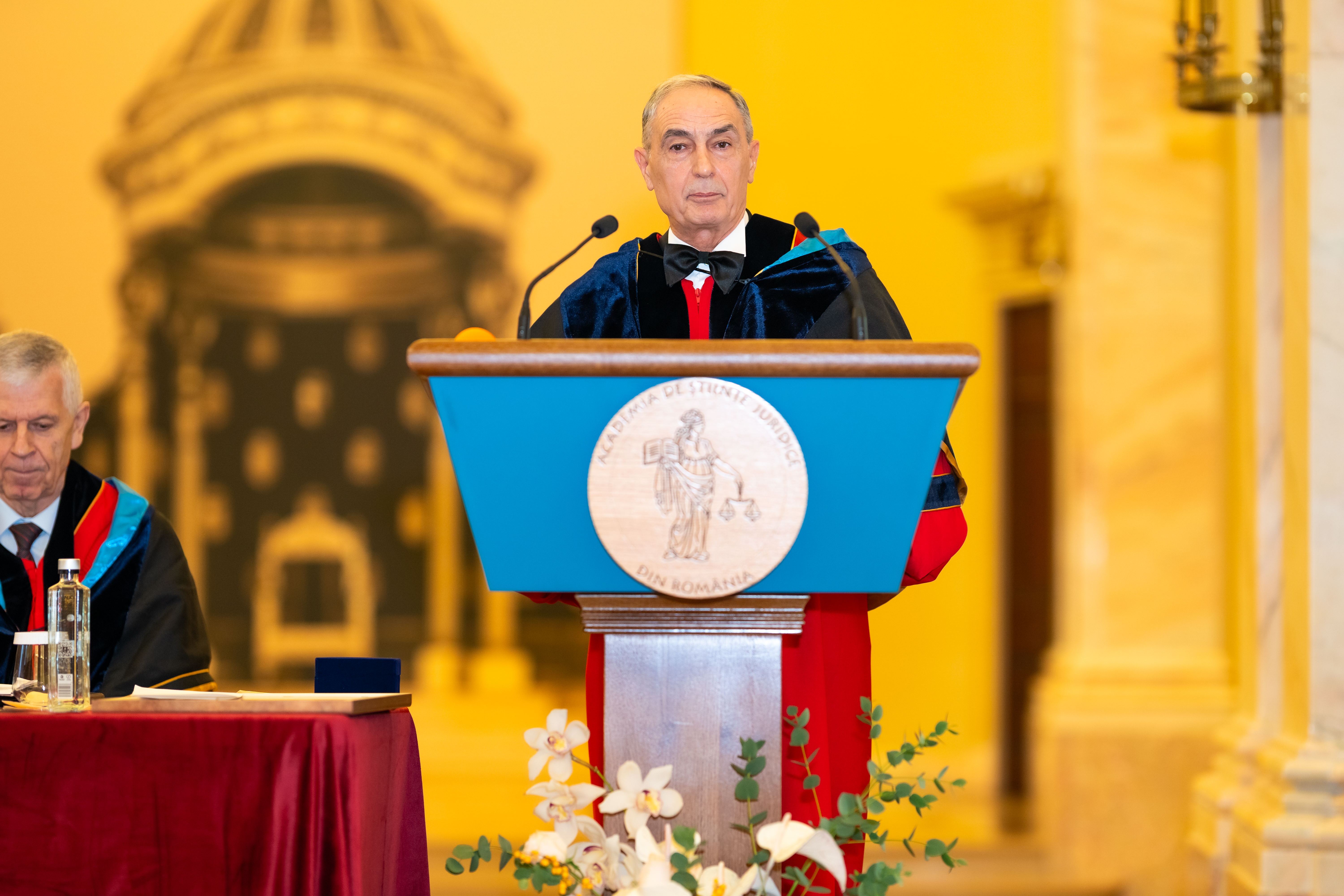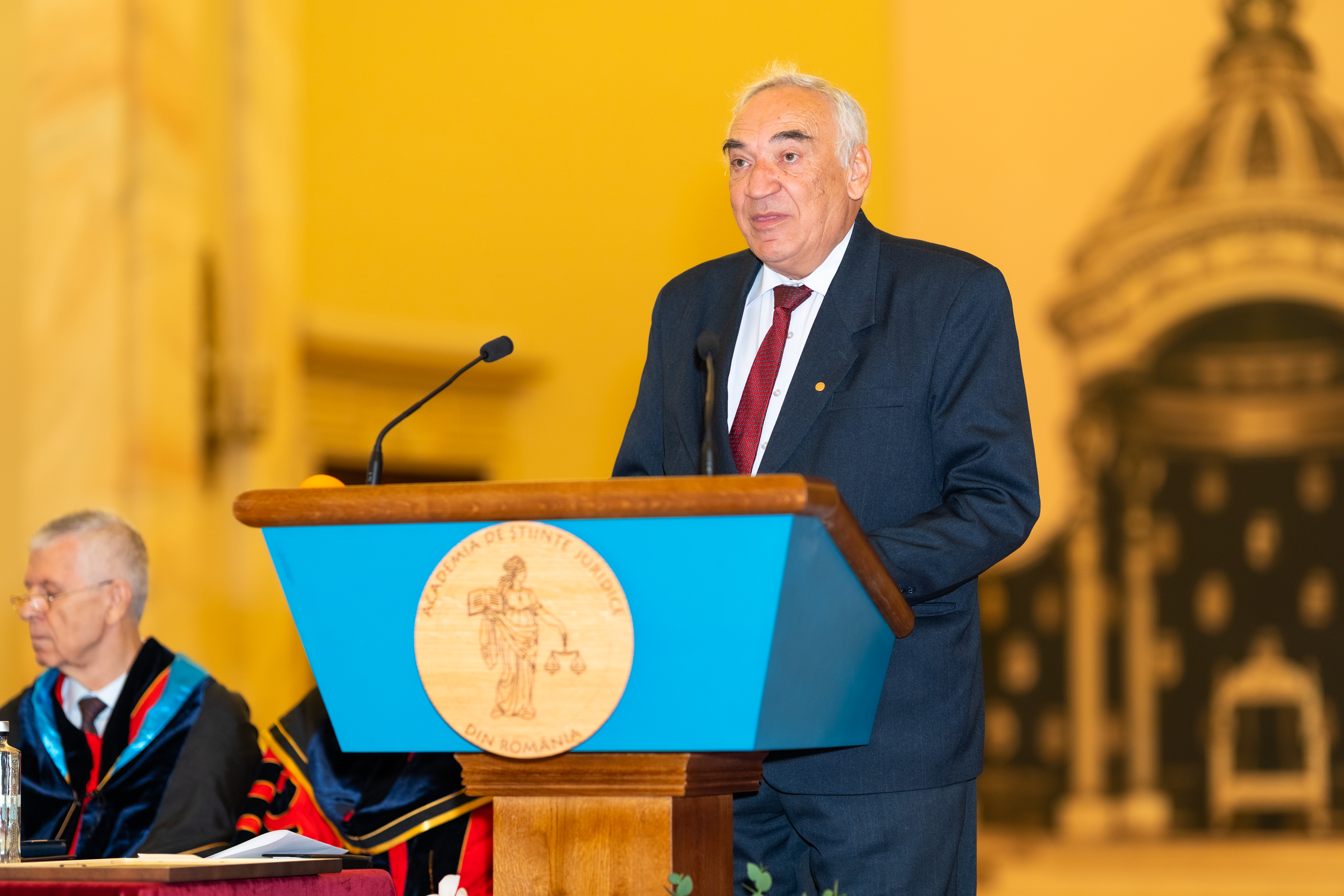 Ceremonia solemnă a fost deschisă prin alocuțiunea susținută de Prof. univ. dr. Liviu Bogdan CIUCĂ, președintele AȘJR. Președintele CIUCĂ a menționat importanța rădăcinilor și a reperelor istorice, care stau la baza dezvoltării țării, astfel amintind de fondatorii Academiei de Științe Juridice din Romania și personalitățile remarcabile din domeniul dreptului.