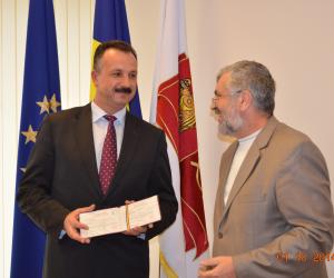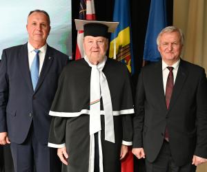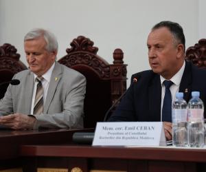 În imaginea realizată la 1 octombrie 2014, acad. Valeriu Canțer îi vorbește ceva noului doctor habilitat Emil Ceban, ambii binevoitori zâmbesc, dar cu siguranță că i-a urat și succes în cariera profesională și socială.