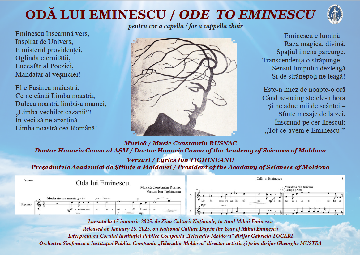 În acest context, consider că simbolul veritabil al Anului Mihai Eminescu este „Oda lui Eminescu” – creație muzicală inspirată de Luceafărului literaturii române. Muzica aparține profesorului Constantin Rusnac, cunoscut compozitor și Doctor Honoris Causa al Academiei de Științe a Moldovei, iar versurile sunt semnate de academicianul Ion Tighineanu, președintele Academiei de Științe a Moldovei. Înregistrarea lucrării a fost realizată cu aportul Capelei Corale „Moldova” (dirijor – Gabriela Tocari) și al Orchestrei Simfonice a Companiei Naționale „Teleradio Moldova”, sub bagheta conducătorului și prim-dirijorului academician Gheorghe Mustea.