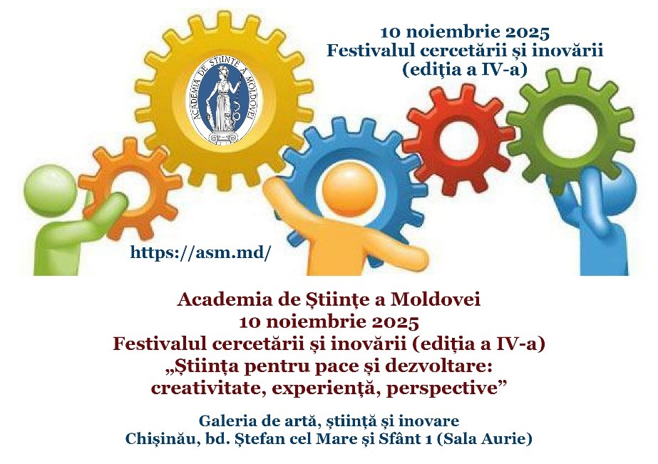 Academia de Științe a Moldovei invită cercetătorii științifici să participe la Festivalul cercetării și inovării „Știința pentru pace și dezvoltare: creativitate, experiență, perspective”. Cea de-a patra ediție va avea loc la 10 noiembrie 2025, cu începere de la ora 11.00, în Sala Aurie a AȘM (bd. Ștefan cel Mare și Sfânt 1).