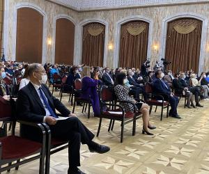 „Mulțumim pentru această donație extraordinară, care este un semn de susținere pentru Republica Moldova, cultura Republicii Moldova, Filarmonica Națională și vreau să mulțumesc și artiștilor Filarmonicii pentru că avem această seară extraordinară. Sigur că vreau să mulțumesc și maestrului Eugen Doga pentru prezența lui și pentru acest lucru extraordinar care l-a pregătit pentru astăzi. Uniunea Europeană nu a rămas nici de această dată indiferentă, vorbesc despre cazul tragic care s-a întâmplat cu Filarmonica Națională, și continuă să sprijine și din acest punct de vedere Republica Moldova”, a menționat Ambasadorul UE în Republica Moldova, Peter Mihalko. Excelența Sa a accentuat că este mereu în contact cu autoritățile, inclusiv Președinție, Ministerul Culturii, pentru a vedea și examina cum pot fi utili în susținerea acțiunilor de mai departe în reconstrucția edificiului de cultură.