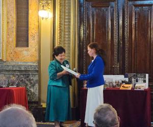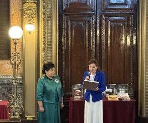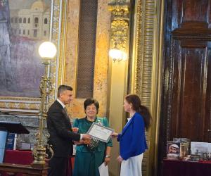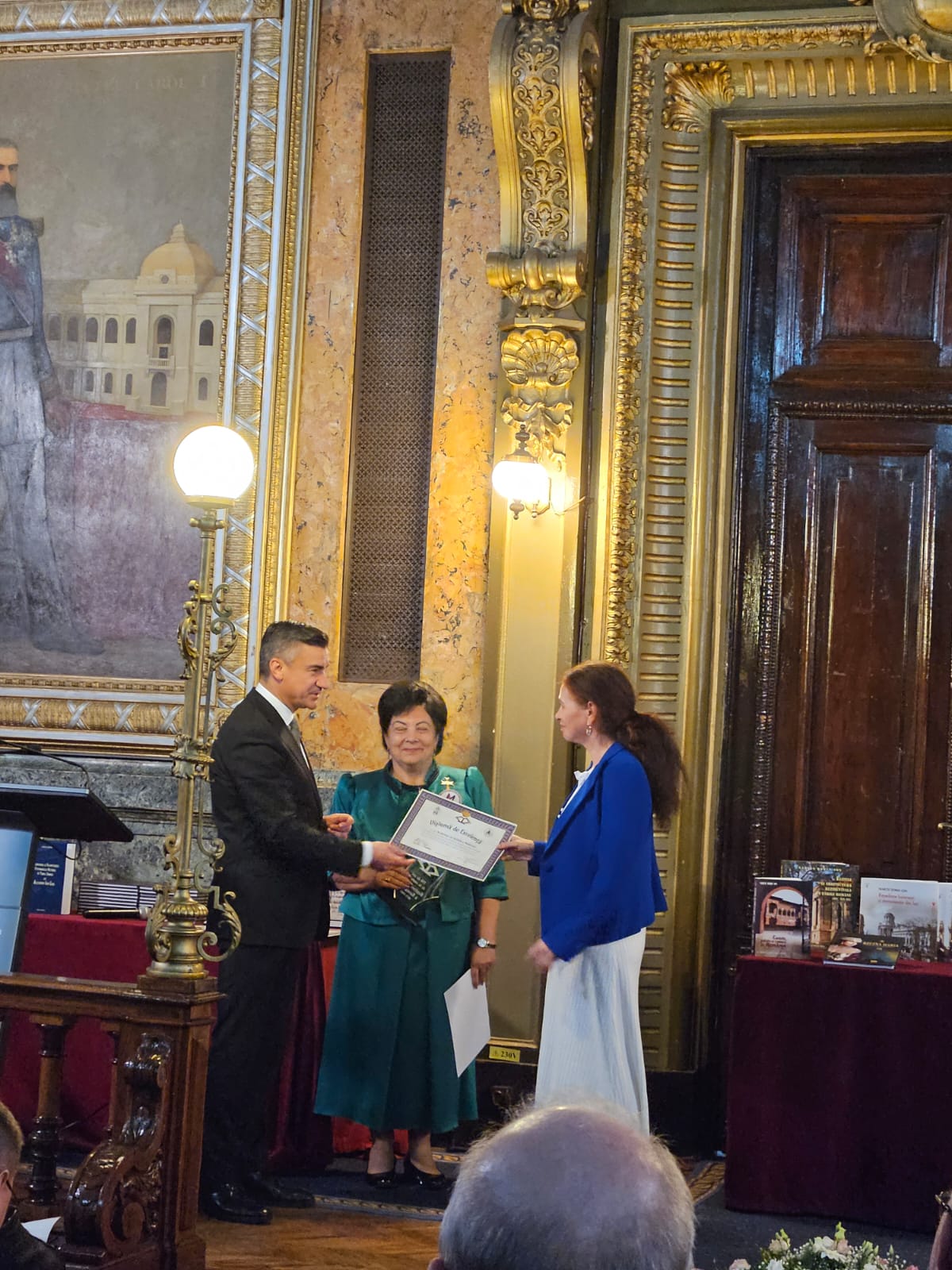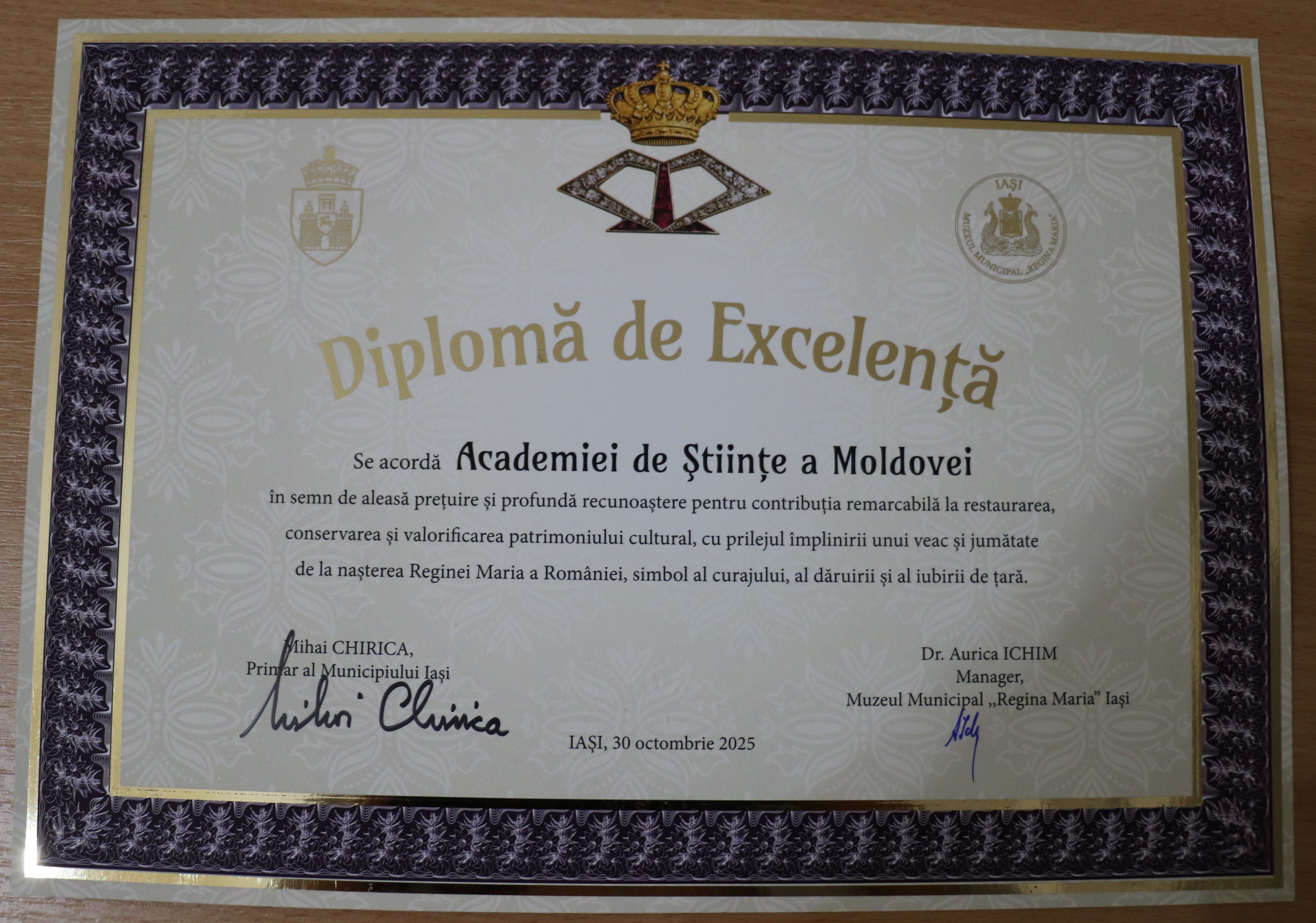 În cadrul sesiunii de conferire a distincțiilor, desfășurată în Aula ,,Carmen Sylva” a Universității ,,Gh. Asachi” Iași, în numele Prezidiului AȘM subsemnata a înmânat diploma „Meritul Academic” doamnei dr. Aurica Ichim, în semn de înaltă recunoștință pentru activitatea desfășurată în domeniul patrimonializării. De asemenea, la 150 de ani de la nașterea reginei Maria a România, Muzeul Municipal din Iași ce-i poartă numele și Primăria municipiului Iași au conferit pentru Academia de Științe a Moldovei „Diploma de Excelență” și Trofeul respectiv.